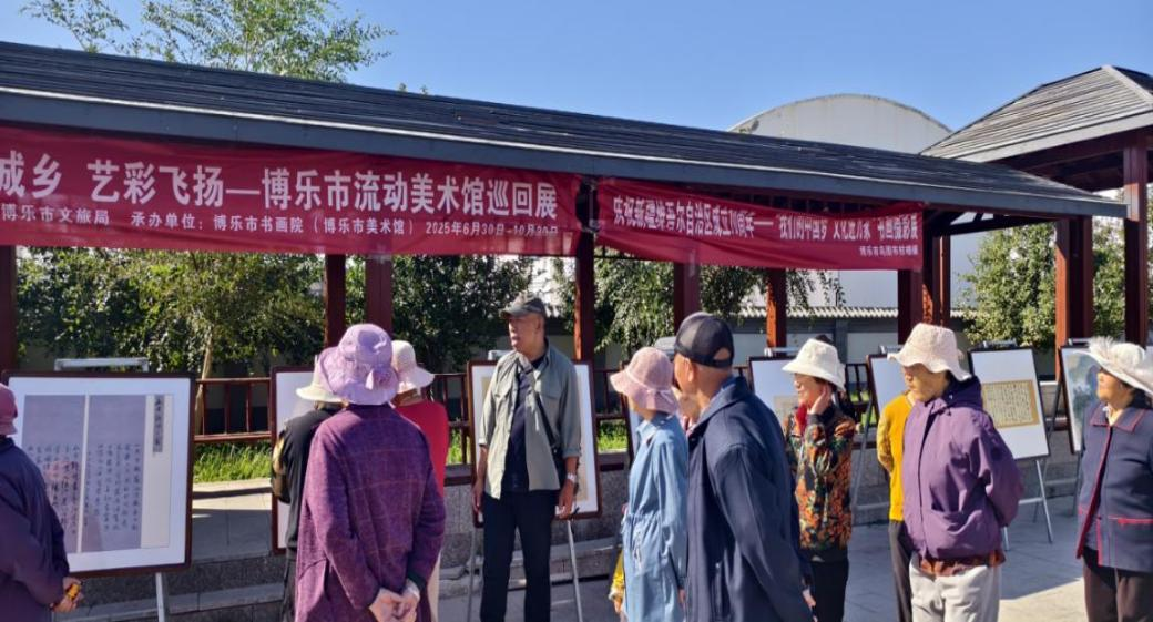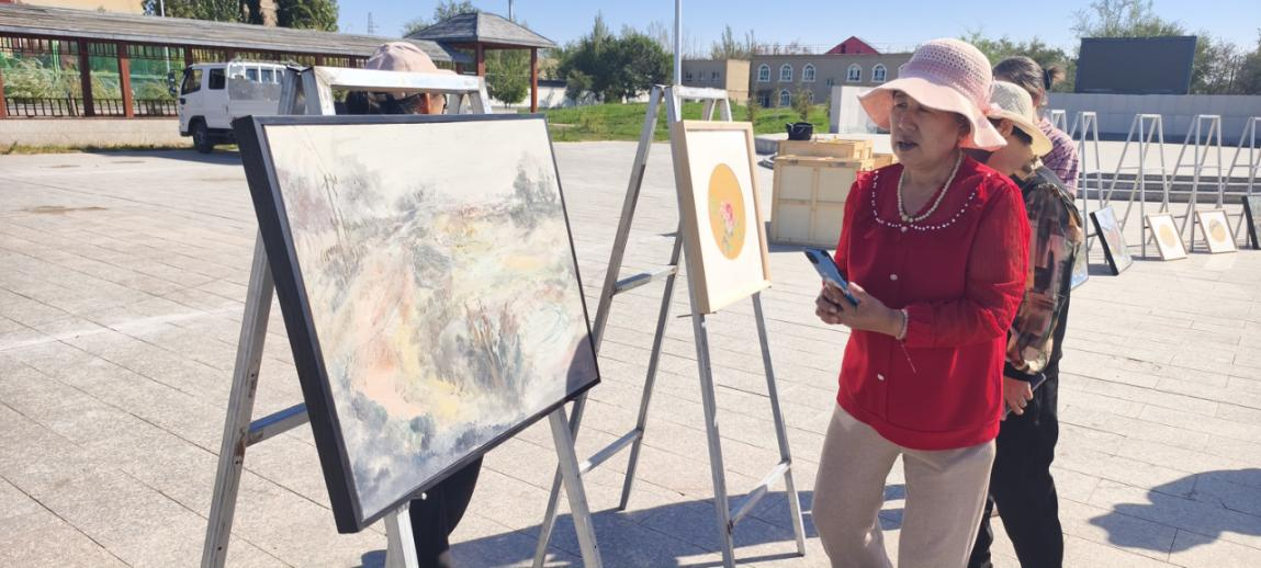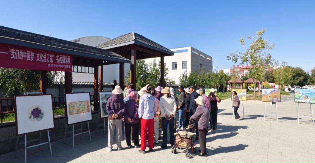 为庆祝新疆维吾尔自治区成立70周年,扎实推进“文化润疆”工作,丰富各族群众精神文化生活,9月5日,博乐市书画院(美术馆)联合乌图布拉格镇在江夏公园开展“我们的中国梦文化进万家”书画摄影展。