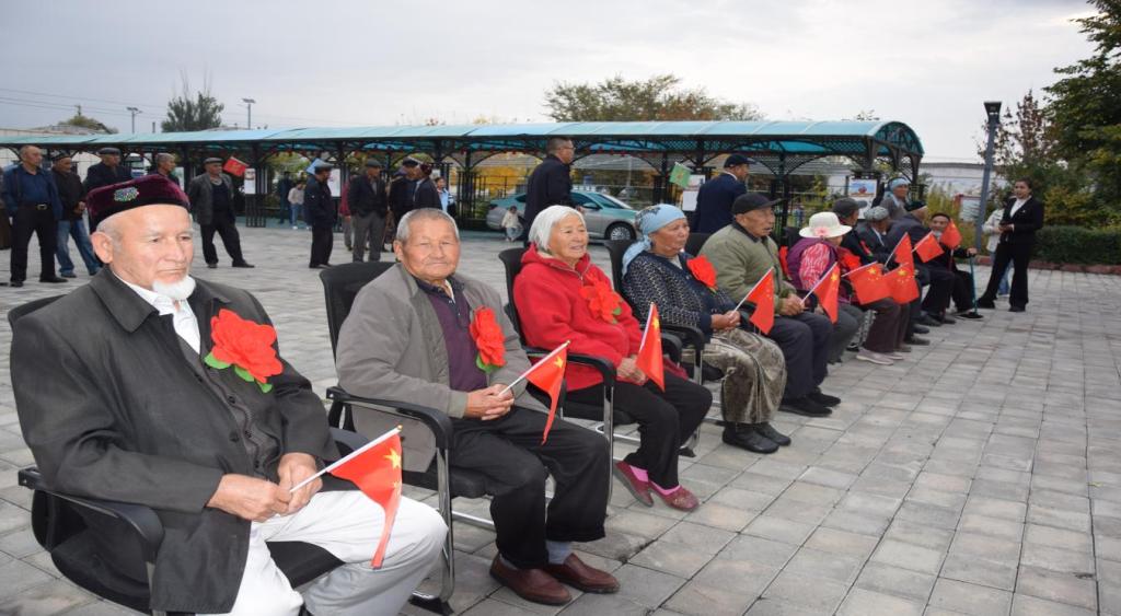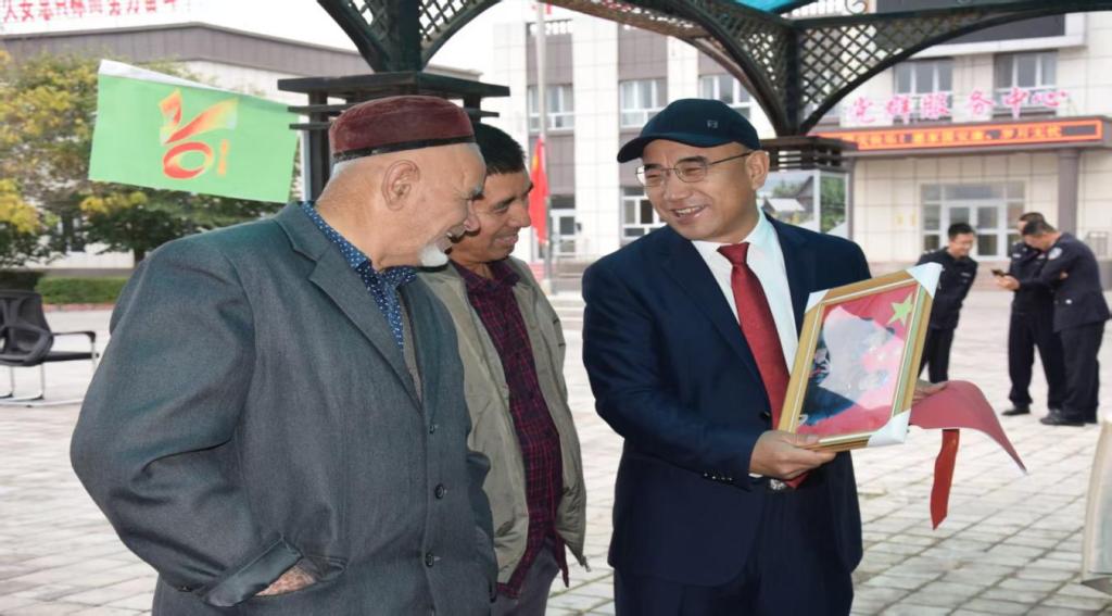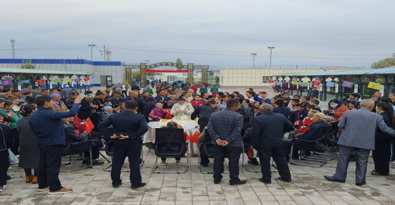 过寿辰,传温情:村干部推出生日蛋糕,全场共唱生日歌;村干部为每位老人佩戴大红花,赠送鲜花及全家福相框等“生日礼包”,99岁的艾斯那吉老人感慨:“第一次过集体生日,和国庆一起过,太幸福了!”
