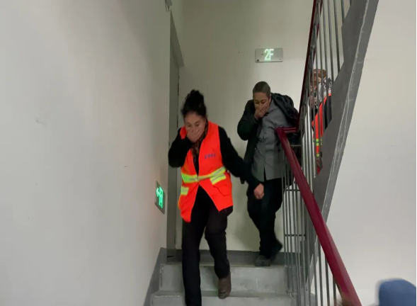 随后,模拟火灾应急疏散演练正式开始。随着一阵急促的警报声响起,工作人员迅速组织居民用湿毛巾捂住口鼻,低姿弯腰,沿着预定疏散路线快速、有序地撤离至小区空旷的安全地带,整个疏散过程紧张有序,快速完成了全部人员疏散任务。