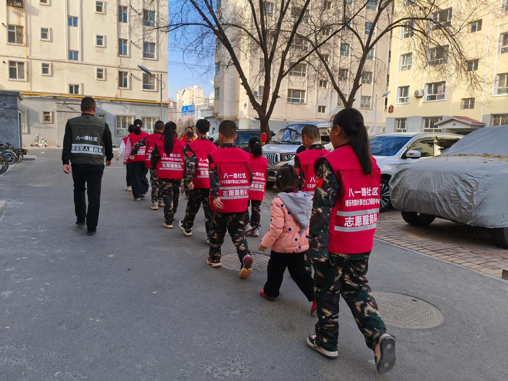 为了让国防教育“看得见、摸得着”,两位志愿者带领孩子们开展“小小义警”模拟巡逻。他们身着红马甲、列队行进,认真观察小区环境,记录安全隐患,体验义警每晚的巡逻路线与内容,安全意识与责任感悄然生根。