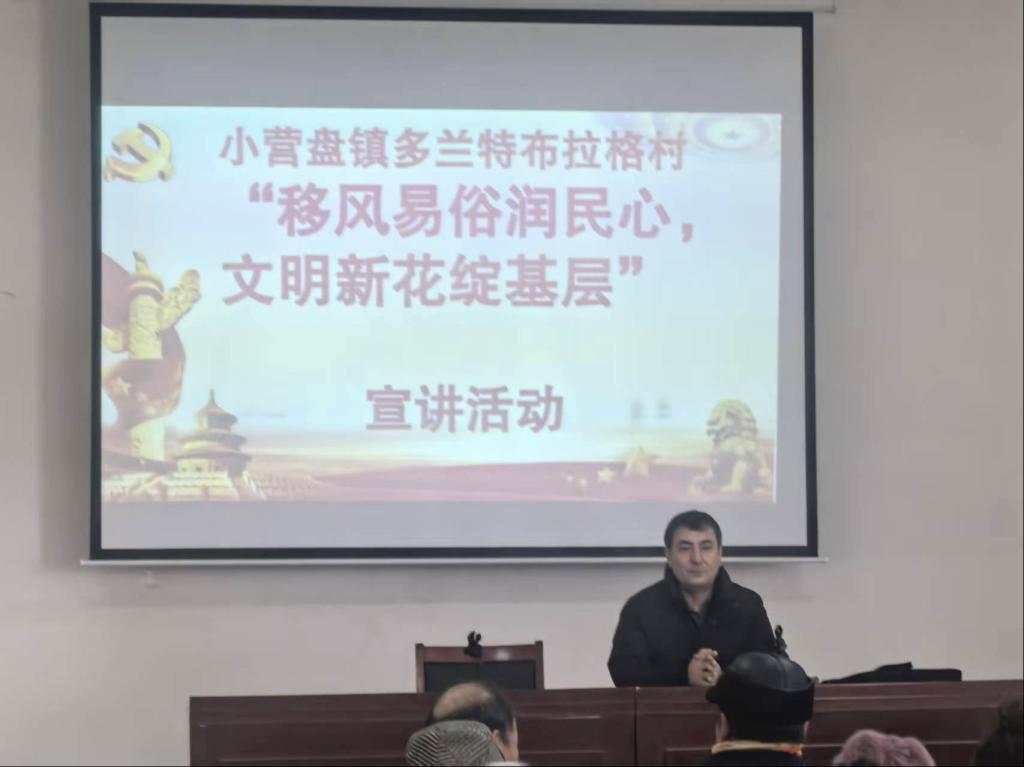 为进一步深化精神文明建设,扎实推进移风易俗工作,引导群众摒弃陈规陋习,树立崇德向善、勤俭节约、文明健康的新风尚,近日,小营盘镇邀请博乐市移风易俗专班教师到小营盘镇多兰特布拉格村,组织开展以“移风易俗润民心 文明新花绽基层”为主题宣传活动,将文明新风吹入千家万户,参与人数50余人。