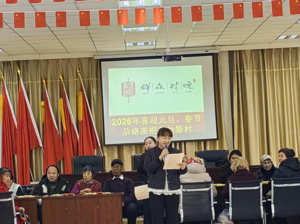 12月30日,尕格茨根乌拉斯村文明实践站文化服务活动中心开展2026年庆元旦迎新春群众村晚活动。参加活动的群众近150人,大家欢聚一堂,共庆2026年元旦。
