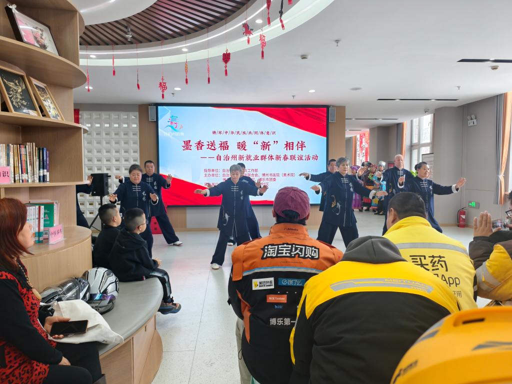 活动现场热闹非凡,旗袍走秀《平遥古韵》、太极拳表演《阳式三十七式》、葫芦丝演奏《欢乐彝族年》等节目轮番登场,精彩的演出赢得现场观众阵阵掌声。博州书画院的艺术家们现场挥毫泼墨,一幅幅洋溢着新春气息的春联、一个个饱含祝福的“福”字,被送到新就业群体代表手中。互动游戏“圈住幸福”将现场氛围推向高潮,欢声笑语此起彼伏;银龄志愿者们提供的免费义剪服务,更是让大家感受到实实在在的贴心关怀。
