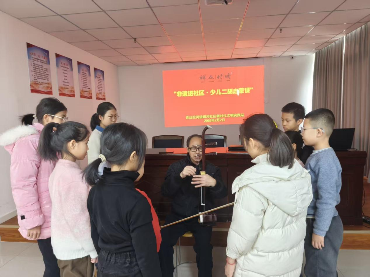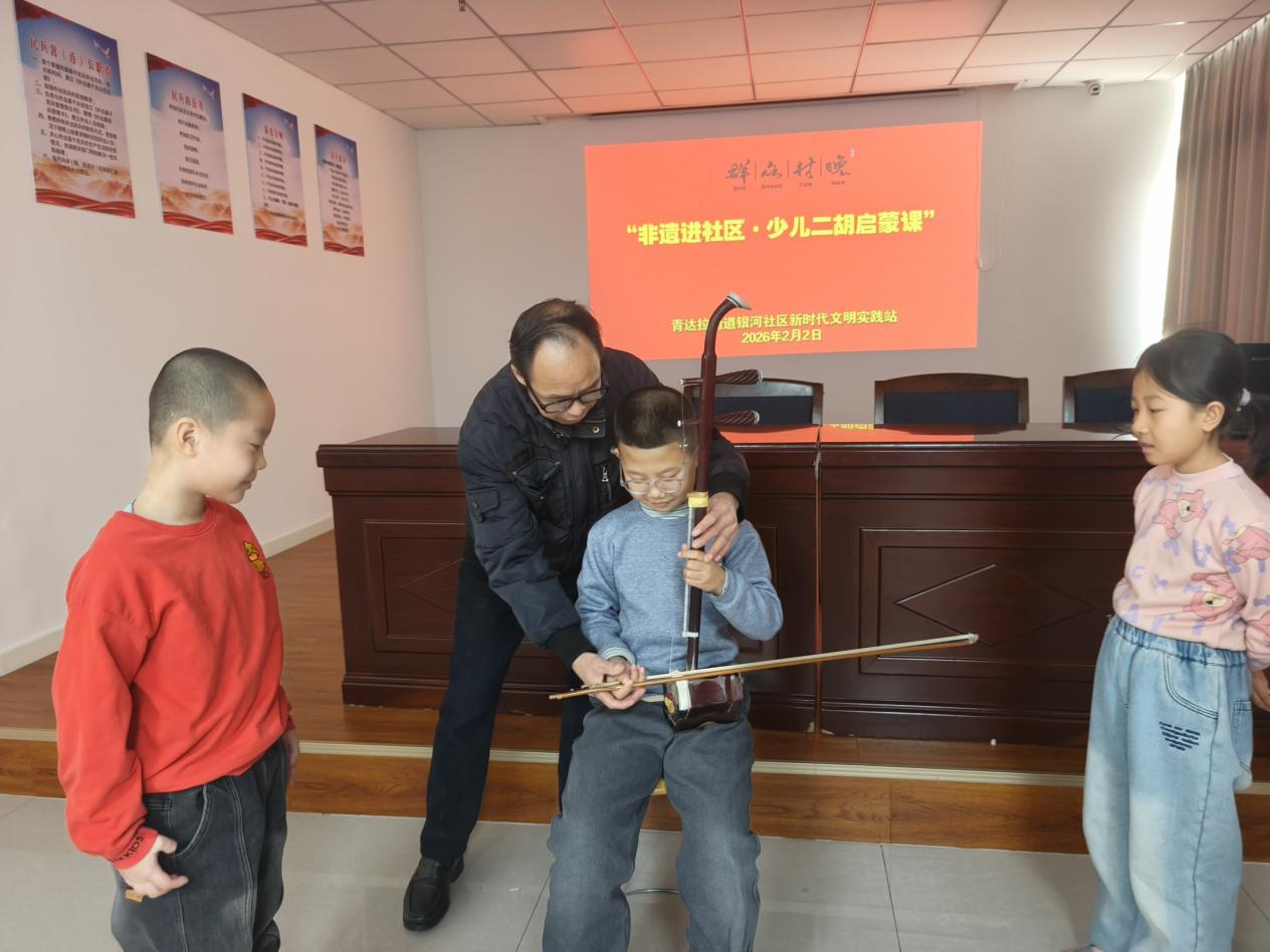 为推动非物质文化遗产走进青少年生活,厚植传统文化根基,2月2日,银河社区特别邀请辖区内二胡文化能人赵兴波老师,为孩子们带来了一场别开生面的少儿二胡启蒙课。活动现场弦音袅袅、童趣盎然,孩子们在指尖与琴弦的互动中,开启了与传统民乐的美好邂逅。
