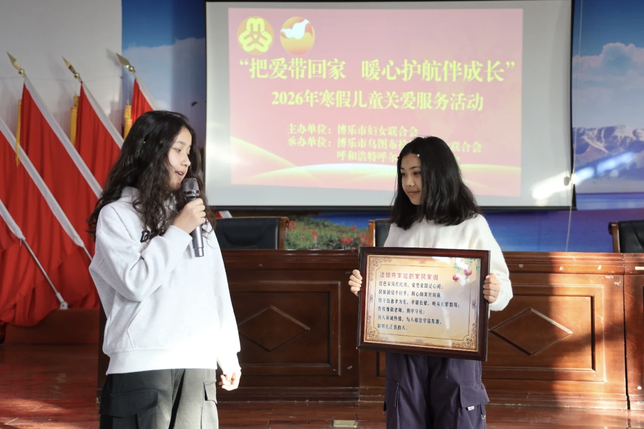 2月4日,博乐市妇联、乌图布拉格镇妇联、呼和浩特尔村妇联三级联动,开展“把爱带回家 暖心护航伴成长”寒假儿童关爱服务活动,以家庭教育、家风传承、安全守护、亲情陪伴为核心,为辖区儿童与家长送上冬日暖心服务,筑牢儿童寒假成长安全防线。