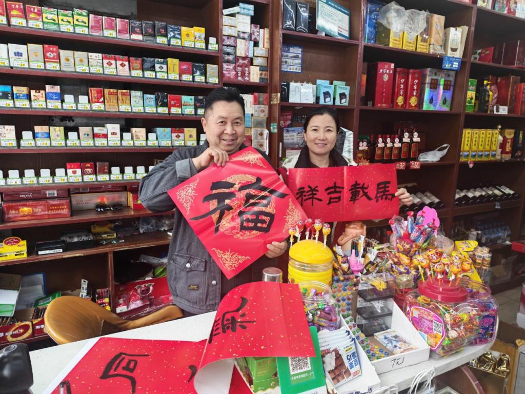 除了走访居民家庭,“送福小分队”还走进辖区商超便利店、物业办公室,为坚守岗位的保洁人员、物业工作者等一线劳动者与新就业群体送上春联礼包。“辛苦了!感谢大家一年来为社区建设的辛勤付出,祝您新春快乐、平安顺遂!”接过这份暖意满满的祝福,物业保洁员董业飞感动地说道:“没想到社区还惦记着我们,这份祝福太贴心了,心里特别温暖!”