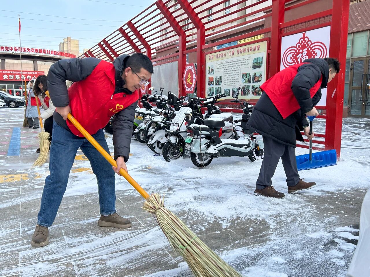 活动中,在职党员统一佩戴志愿标识,分组行动、分工协作、热情高涨。大家手持扫帚、垃圾夹、抹布、垃圾袋等工具,对小区主干道、绿化带、楼道口、卫生死角及公共休闲区域进行全面清扫整治,认真清理落叶杂物、白色垃圾、烟头纸屑,擦拭宣传栏、扶手等公共设施,引导规范停放非机动车,用辛勤劳动美化社区环境,营造干净、整洁、有序的居住氛围。