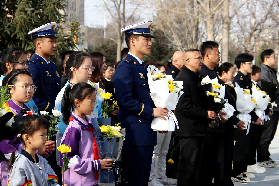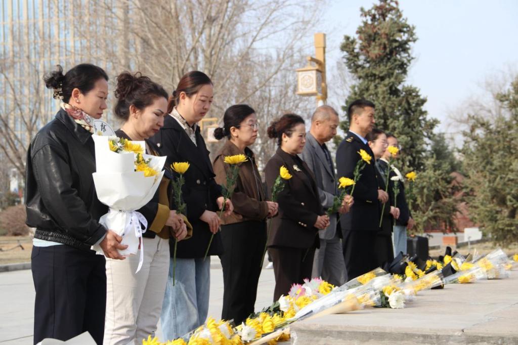 苍松翠柏掩映下,烈士纪念碑巍然屹立、庄严肃穆。参加活动全体人员着装规范、队列整齐、神情庄重,齐声高唱中华人民共和国国歌,随后,全体向为民族独立、人民解放事业英勇献身的烈士们肃立默哀。默哀毕,大家手持菊花,依次缓步走向纪念碑,将鲜花轻轻摆放在碑前,朵朵鲜花寄托着对先烈的无限哀思,表达了对革命先辈的敬仰之情。