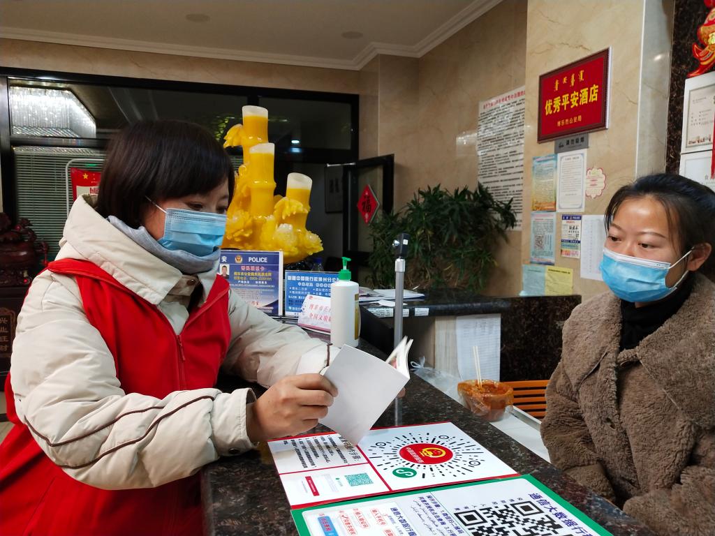 在联通路华融酒店,志愿者为店员讲解了安全健康防护知识,三必查,四必做,发放安全教育材料,引导店员把顾客的安全健康放在第一位,不扎堆,不聚集,积极学习防疫健康知识;同时,要求店员每日把卫生健康防疫工作放在首位,做好环境消毒工作。在走访餐饮店,志愿者都认真讲解防疫知识,查看访客体温登记情况。业主陈先生说:“做好防疫工作是我们的责任和义务,卫生安全人人有责。希望大家都遵守卫生社会公德,度过一个和谐安康的幸福年!”