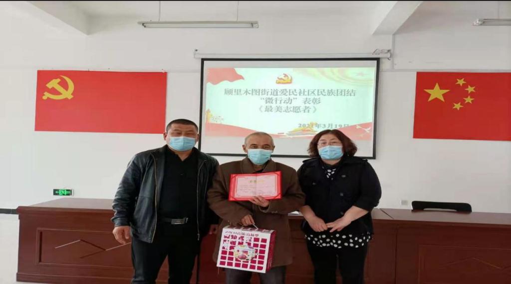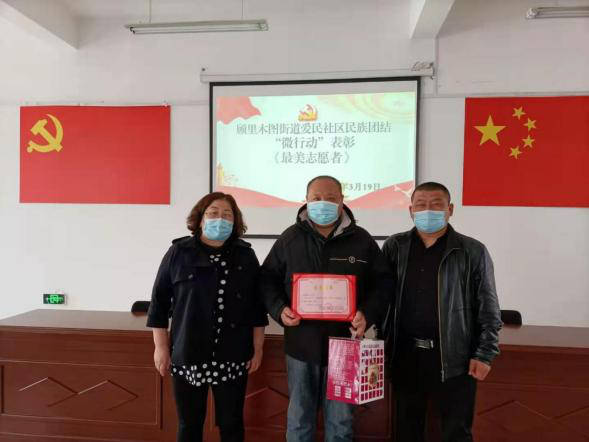 3月22日,爱民社区开展“最美志愿者”表彰活动,阿布里克木是一位退休教师也是爱民社区双联户代表。疫情期间义无反顾的选择当一名志愿者,在鸿丽园小区内超市、二小门口护学岗、博乐市创城等关键时期作为老党员挺身而出,参与广场值班,灯展值班等也不畏艰险的值守,早出晚归。一直以来为留守儿童,孤寡老人送去关爱,弘扬助人为乐的精神,尽自己的一份力去帮助需要帮助之人,尽心尽力10年有余,为爱民社区工作尽微薄之力。