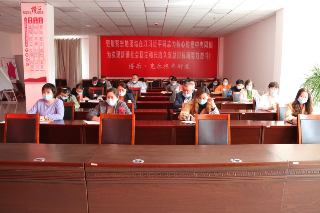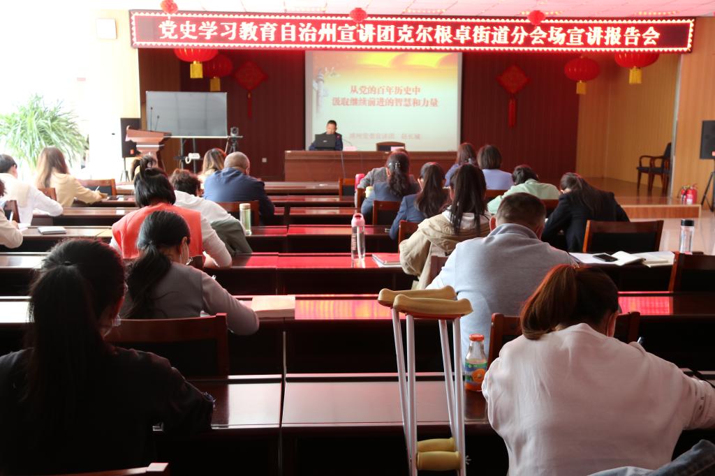 2021年4月8日,党史学习教育自治州宣讲团宣讲报告会在克尔根卓街道举行。自治州宣讲团成员赵长城老师宣讲,街道党工委副书记、组织委员王迅主持报告会并讲话。访惠聚工作队队员、各社区分管党史学习教育的领导、街道党史学习教育办公室各小组成员、街道中层干部聆听报告会。