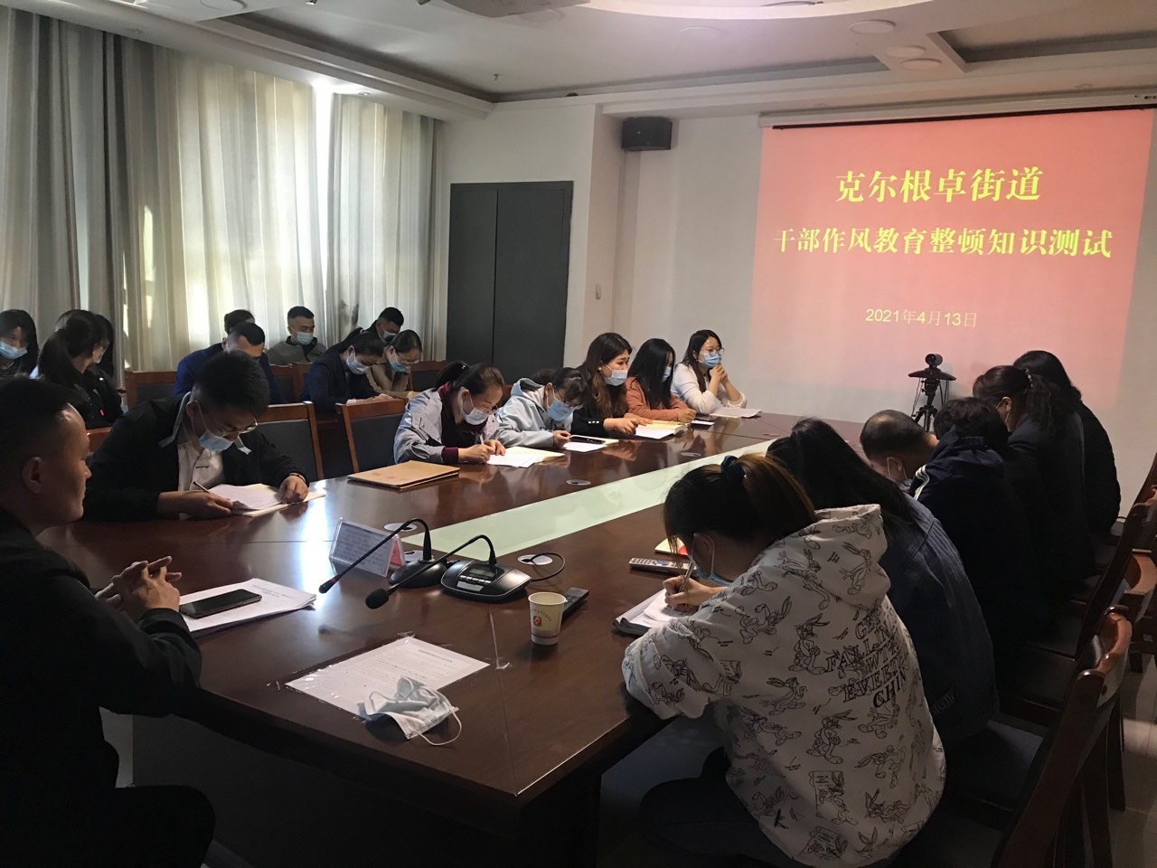 为进一步加深全体机关干部对作风教育整顿学习的重大意义、精神实质的认识和理解,强化党员干部的纪律和规矩意识,2021年4月13日,克尔根卓街道组织全体干部开展干部作风教育整顿知识测试。