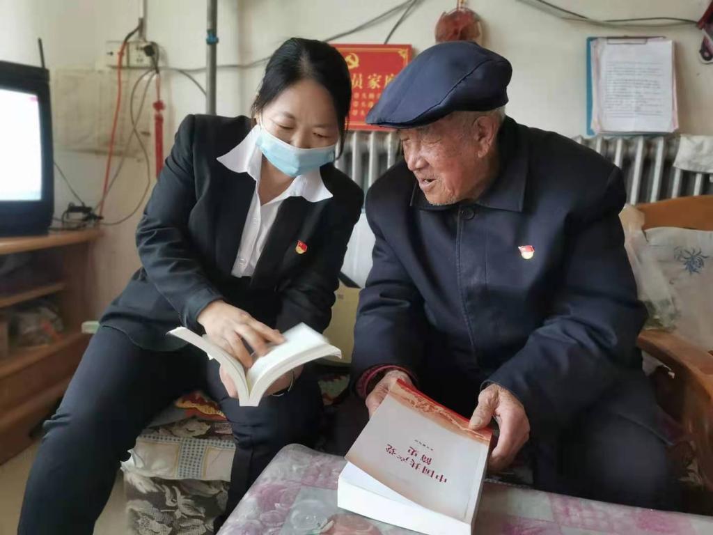 4月20日,小营盘镇托里布拉格东村“访惠聚”工作队第一书记巴格丽玛带领后备干部姚丽开展送学上门工作。金立钺是小营盘镇托里布拉格东村党支部的一名党员,今年91岁,党龄58年,胸前的党徽从没摘下来过,他平时喜欢听新闻和读书,党史学习教育以来,支部党员将学习读本送到老人家中,并开展了送学上门活动。姚丽问起老人有没有学习党史,老人缓慢起身回屋去了,不一会儿把《中国共产党简史》这本书拿了出来,告诉大伙:“我看到这了,折起来了。”姚丽接过书一看,说:“大爷,您都学到300多页了,您比我们都厉害呀!”一番嘘寒问暖后,姚丽和金立钺开始学习,两人在学习过程中时不时地交流讨论,分享心得,学习尾声两人还进行了一场问答竞赛,用真才实学验证了所学所悟。