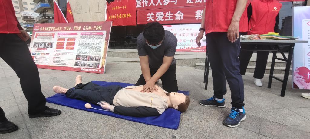 活动中,北京南路社区的志愿者和博乐市红十字志愿者向路过的群众发放党史学习教育宣传单、自救互救知识手册300余份;随后,市红十字会急救培训师为大家详细讲解心肺复苏黄金4分钟的急救流程和操作步骤,并利用人体模型现场进行心肺复苏模拟演示,手把手指导在场人员进行心肺复苏练习。现场气氛活跃,大家踊跃提问并纷纷上前进行实践技能操作。