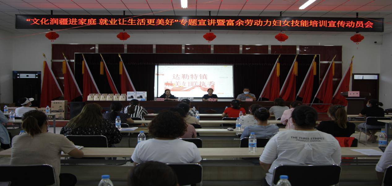 6月23日,达勒特镇妇联组织各村队(社区)的妇联主席及有意向报名参加技能培训的妇女开展“文化润疆进家庭、就业让生活更美好”专题宣讲暨富余劳动力妇女技能培训宣传动员活动,并邀请了市妇联党组书记、主席王颖,市人社局创业办主任侯胜平来参加技能培训宣传动员会。