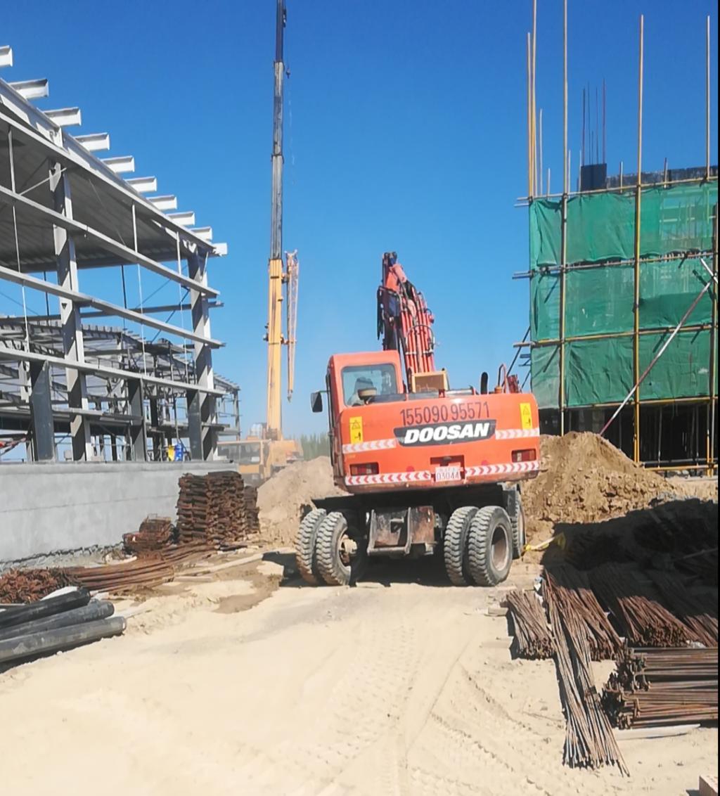博乐市贝林哈日莫墩乡年产20万吨新型水溶肥及智慧农业建设项目现场压路机、搅拌机及各种运输车辆往来穿梭,工人们繁忙有序地工作着,钢框架的厂房以及综合楼主体已完成。