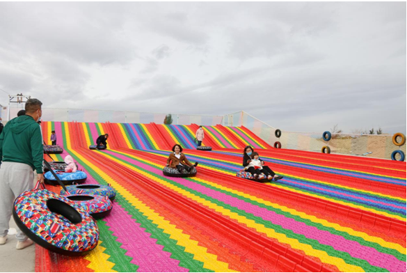 来到这里我们被眼前颜色绚丽、基础设施齐全的彩虹滑道深深吸引,游客、各党员干部们积极体验了介格得布拉格村的彩虹滑道项目并拍照打卡。