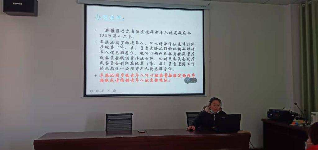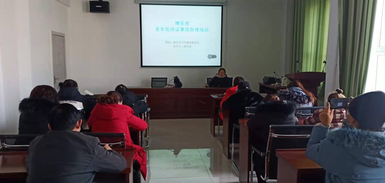 为做好各村队、社区《老年优待证》办理工作,让全场老年人在家门中就可以办理《老年优待证》,方便服务群众,12月15日下午,阿热勒托海牧场计生办邀请市卫健委副主任刘富强和市卫健委窗口干部李雪莲深入阿场卫生院开展了办理《老年优待证》操作系统培训班,各村队、社区业务经办人共计13人参加了培训。