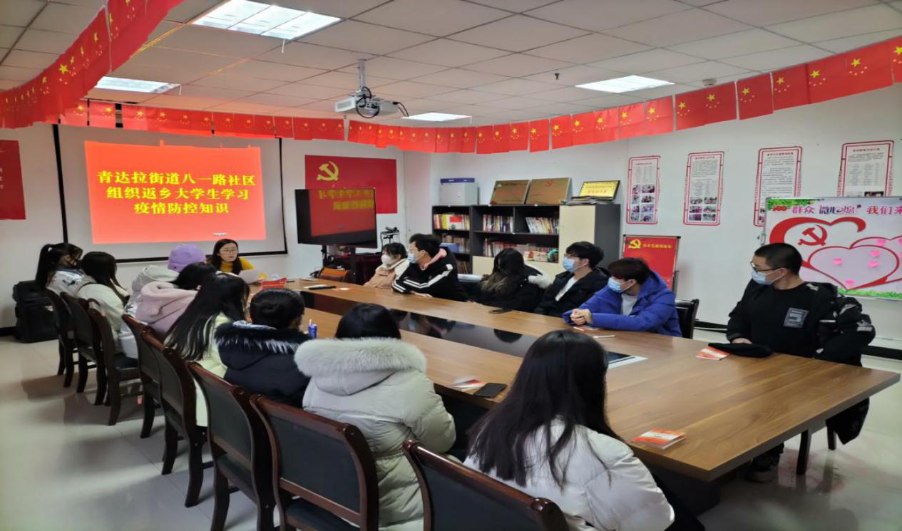 组织“返乡大学生”开展寒假期间志愿服务岗前培训活动,社区第一书记、党总支书记图娅为大学生讲解知识,让志愿者能够在做好个人安全防护的前提下,协助社区疫情专干做好消杀、核酸检测秩序维护、信息登记等工作。