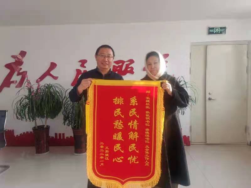 2月12日,州国税局小区居民艾买提江·沙依木妻子布海里坎木·库尔班将将一面印有“系民情解民忧,排民愁暖民心”的锦旗送到了驻长城社区“访惠聚”工作队第一书记、工作队队长张钦明手中,诚挚感谢社区给予的关心和帮助,接过锦旗后,张钦明同志连连说:“这是我们应该做的”。