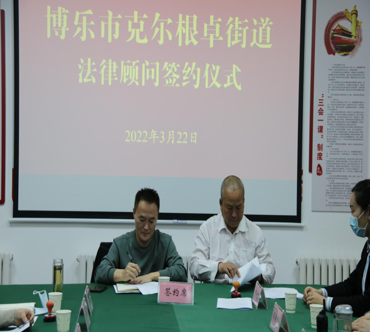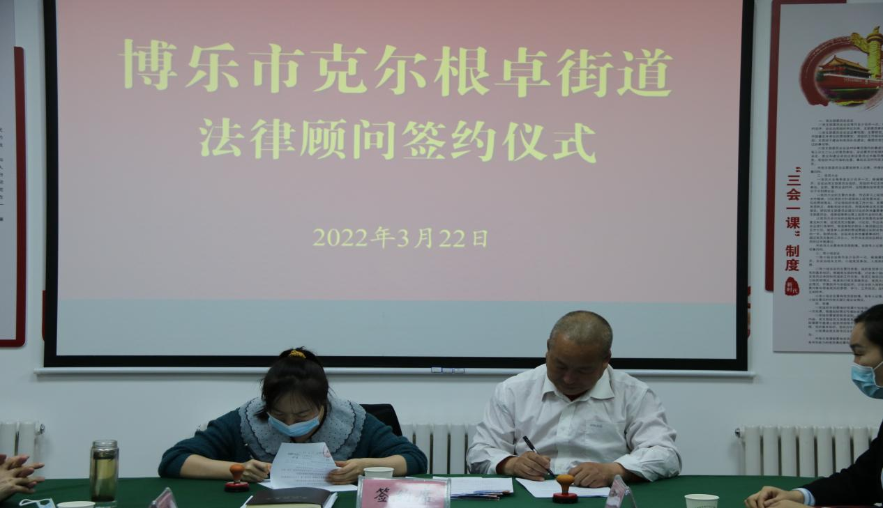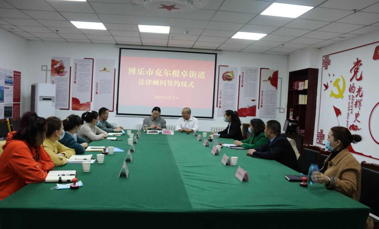 为推进法律服务进基层,增强广大基层干部群众的法律意识,规范基层组织民主决策、依法办事等各项程序,引导群众通过合法途径表达诉求。3月22日,克尔根卓街道办事处举行“一社区一法律顾问”签约仪式,街道及11个社区与张永鹏律师签订协议,聘请他为街道法律服务中心法律顾问。