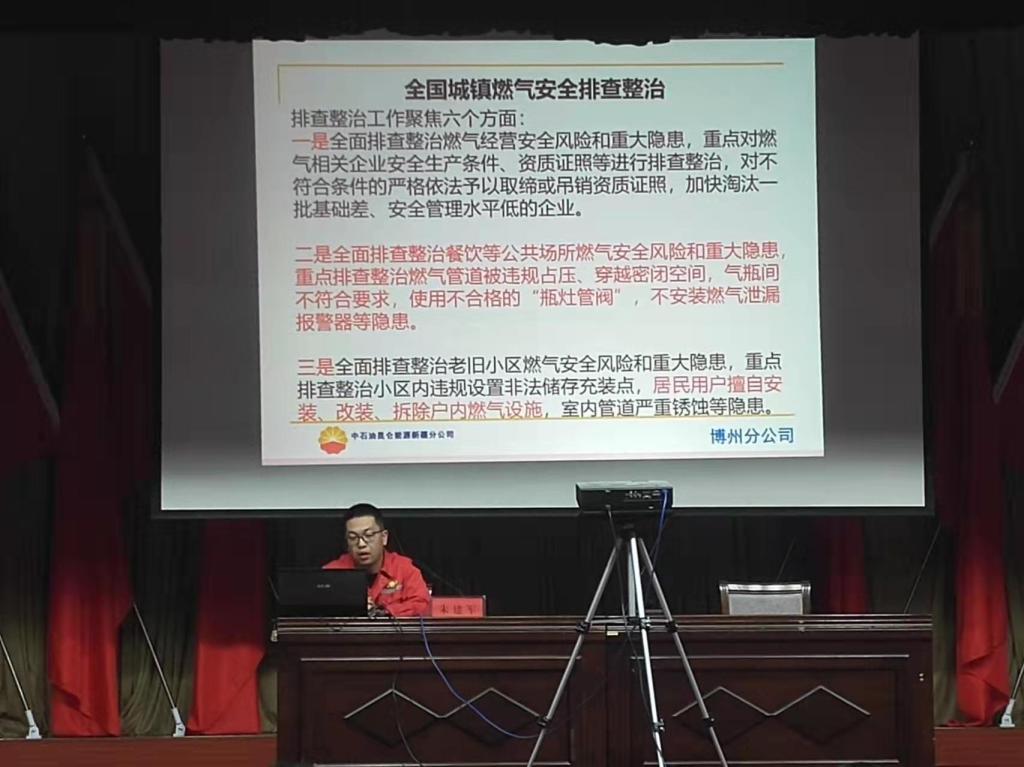 为使我市居民安全、正确的使用天然气,2022年3月28日,博乐市应急管理局、博乐市住建局、博乐市消防救援大队联合新疆新捷燃气博尔塔拉蒙古自治州分公司,组织全市各乡镇、街道、以及各社区安全负责人在市直机关一楼多功能厅进行了天然气正确使用和天然气隐患排查专题讲座,新疆新捷燃气博尔塔拉蒙古自治州分公司安全专家朱建军对大家进行讲解,首先讲解了正确使用天然气和安全用气注意事项,接着讲解了天然气隐患排查以及八不准,然后讲解了天然气事故发生的原因和怎样及时有效处理火灾事故。
