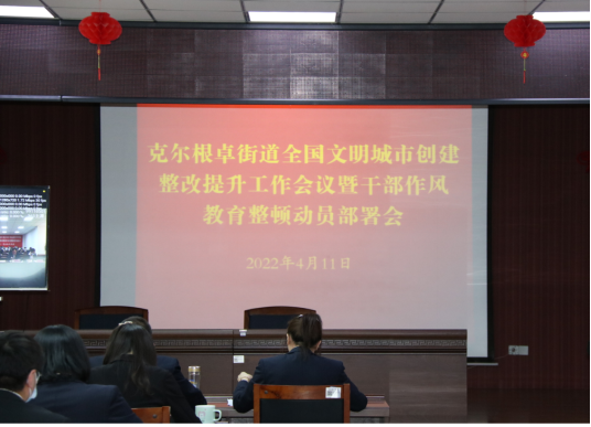为深入贯彻落实习近平总书记关于全面从严治党和作风建设的新要求,贯彻落实博乐市推进全国文明城市创建整改提升工作动员会精神,动员全体干部统一思想、提高认识、转变作风、改进工作,2022年4月11日下午,克尔根卓街道组织召开推进全国文明城市创建提升工作会议暨干部作风教育整顿动员部署会,街道领导班子成员、机关全体干部在主会场参会,社区全体干部通过视频会议在社区分会场参会。
