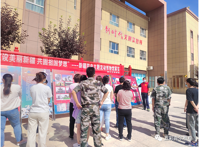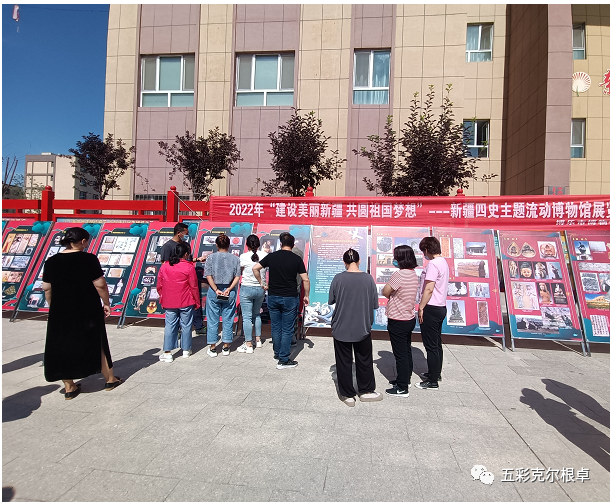 在街道门前,20张宣传展板整齐摆放着,每一张展板图文并茂地展示建设美丽新疆、共圆祖国梦想及新疆四史等内容,博物馆的工作人员向居民一一讲解,吸引了许多过往的居民前来驻足围观。