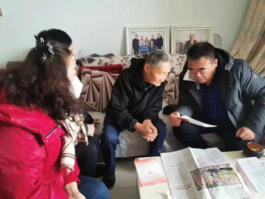 银河社区第一书记张星洲带领“访惠聚”工作队队员和网格员走访老党员范怀忠家,为老人送去退役军人优待证,还将党的二十大精神书籍送给老人,在询问家庭情况时老人感慨地说:“我很满意,房子也很暖和!大家都时常关心我们老两口,我很感谢,有你们在我很暖心。”