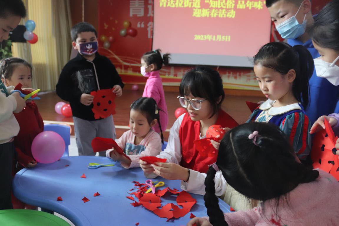 一年一度迎新春,为更好的传承传统文化节日,做好中华民族传统文化教育,2023年1月5日青达拉街道联合博乐市团委开展迎新年系列活动,活动中社区辖区居民代表30余人参加活动,博乐市团委书记孟根霞和青达拉街道孩子一起,在小朋友们的欢声笑语中拉开帷幕。孟书记给小朋友们讲述了“春节”的来历,从到南北朝时,到民国时期。还在活动中开展了非遗文化剪纸活动,用橡皮泥做道具,带领辖区居民儿童一起做糖葫芦,感受传统文化手工艺的制作方法,小小的手捏出一个个小冰糖葫芦,预示着来年红红火火。