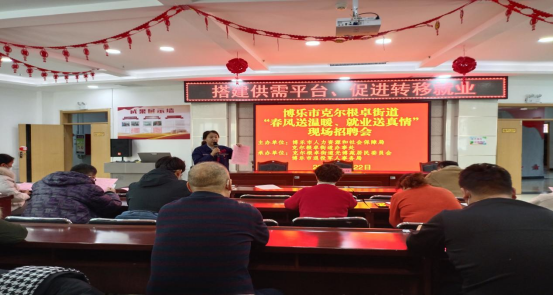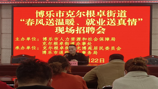 2月22日上午11点,博乐市克尔根卓街道在快乐家园A区光博苑社区一楼的便民服务大厅组织开展以“春风送温暖就业送真情”为主题的现场就业招聘会,有20家企业向求职者提供200余个就业岗位。克尔根卓街道办事处主任敖力杰特在招聘会开幕仪式上做了动员讲话,并预祝所有的求职者早日实现就业。
