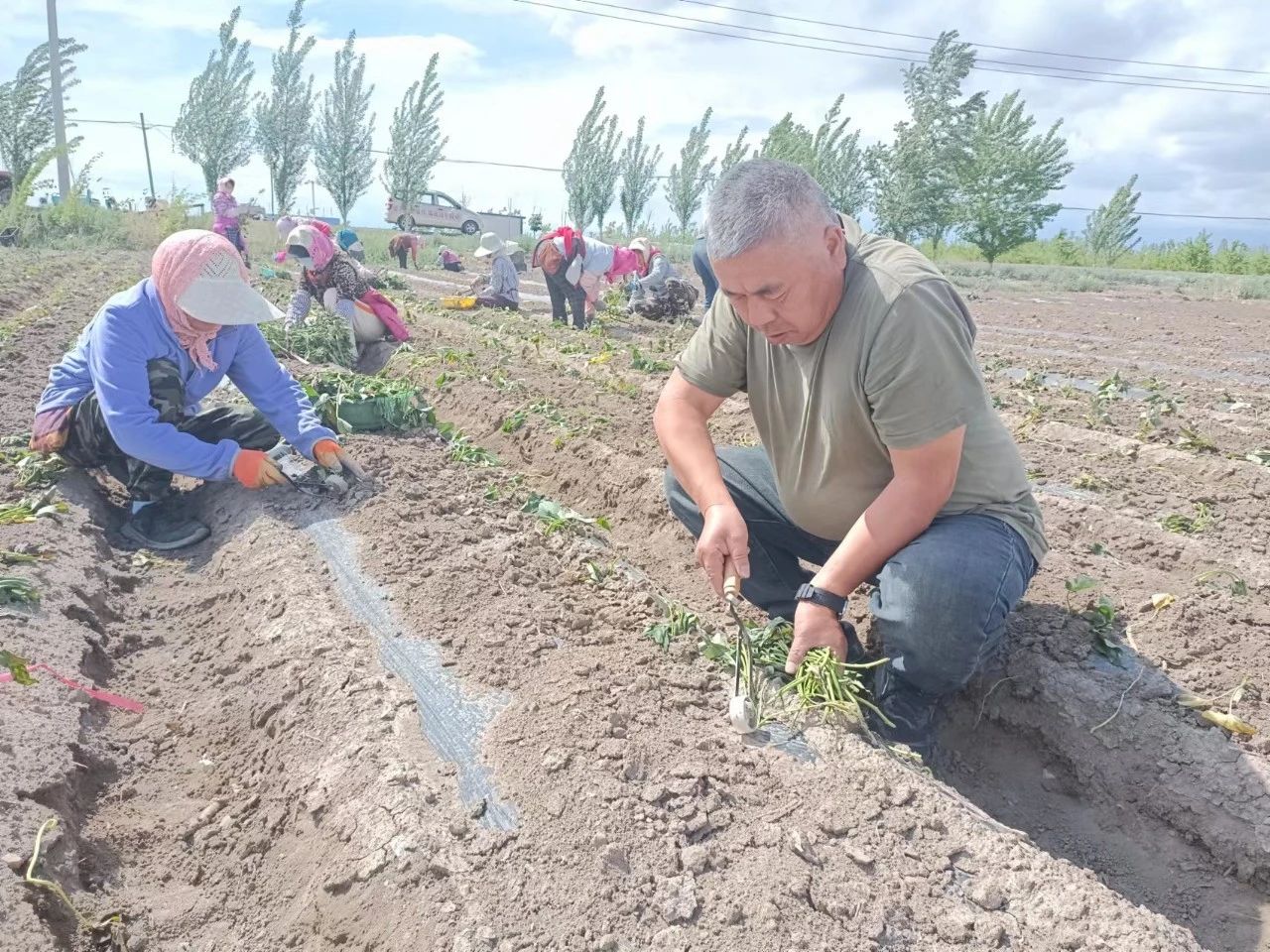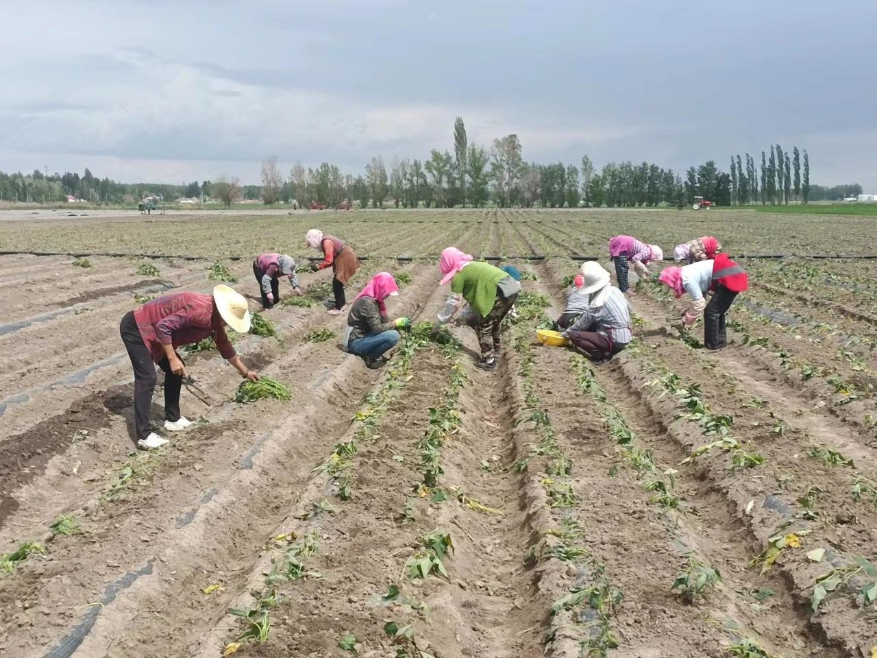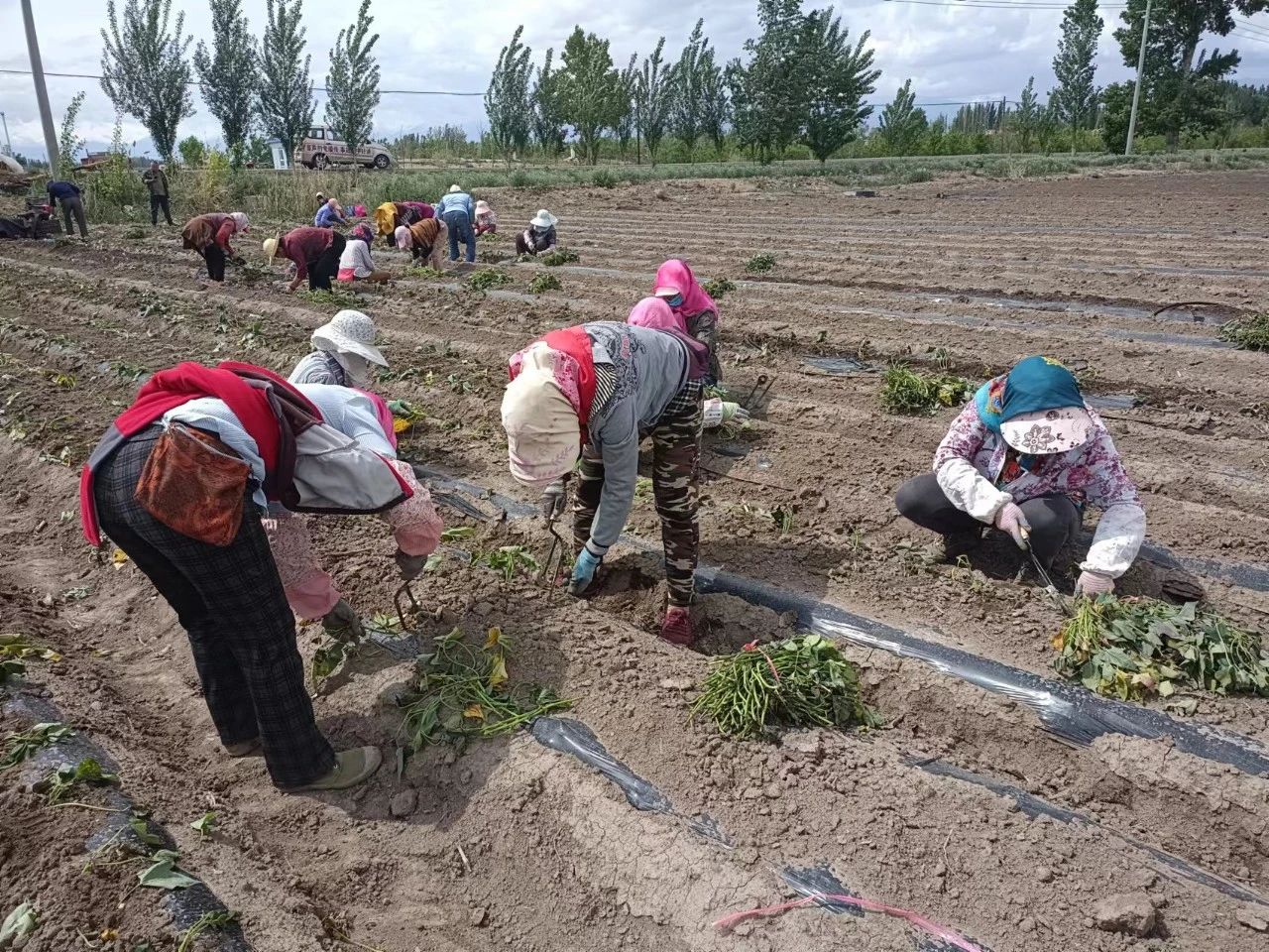 骄阳渐渐收敛了肆意,温柔地洒向大地,博乐市小营盘镇,一垄垄刚刚种植的红薯苗儿与清透的蓝天交相辉映。松土、起垄、栽种、浇水、填苗、压土、覆膜……三十余名群众正在紧张地忙碌着,抢抓农时、栽种希望,这里就是小营盘镇百亩红薯试种植基地。