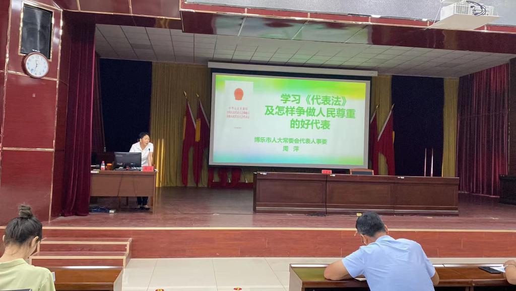 活动中,博乐市人民代表大会常务委员会法制工作委员会主任刘东林,博乐市人大常委会代表人事委周萍对《代表法》进行了深入浅出的阐述,同时就人大代表如何依法履行代表职责、怎样认识代表的性质地位及权利义务,充分发挥代表作用等方面的内容进行详细讲解。引导代表在后续履职工作中将法律触角延伸到最基层,将法律法规带到老百姓生活中,能够引导广大群众自觉尊法、学法、守法、用法。