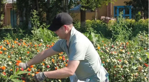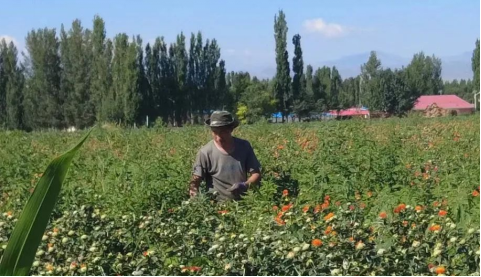 阿里翁白新村承包老板赵析兵介绍说:“在这个阿里翁白新村承包了这块儿土地,这个总面积520亩地,其中呢,这个中药材占了120亩地,红花有60亩地,中间紫苏有30亩地,鸡冠花有30亩地,现在正在采摘,其中就说现在忙碌的就是采摘这个红花,还有这个紫苏这一块儿正在割,目前为止大约有个20多人采摘这个红花,有十个人在割紫苏”。