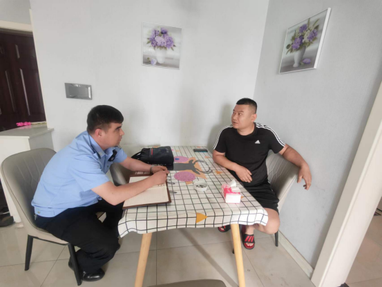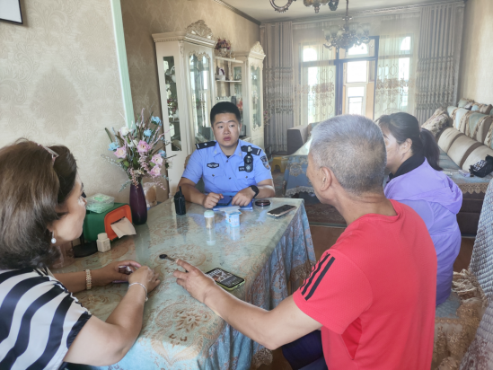 社区民警吕伟与社区干部正在抓紧走访小区里的独居老人,做好用电用气和防暑降温提示,为社区居民提供便民服务的同时开展防电诈宣传工作。