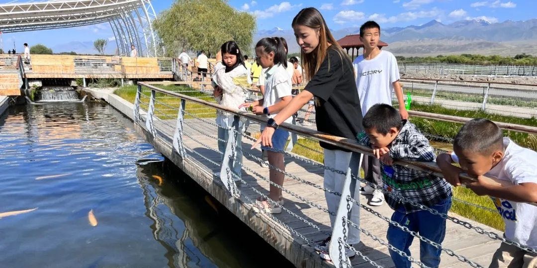 研学实践活动第一站走进了温泉县冷水鱼主题公园。阳光下鱼儿欢畅,不仅可以观赏到高白鲑、金鳟鱼、虹鳟鱼等各种冷水鱼,也能看到鱼类不同“年龄段”的萌态。通过工作人员的介绍,同学们了解到温泉县泉水丰富,养殖冷水鱼的条件得天独厚,依托温泉冷水鱼良种繁育中心,还承担着赛里木湖及疆内冷水鱼种苗繁育重任。