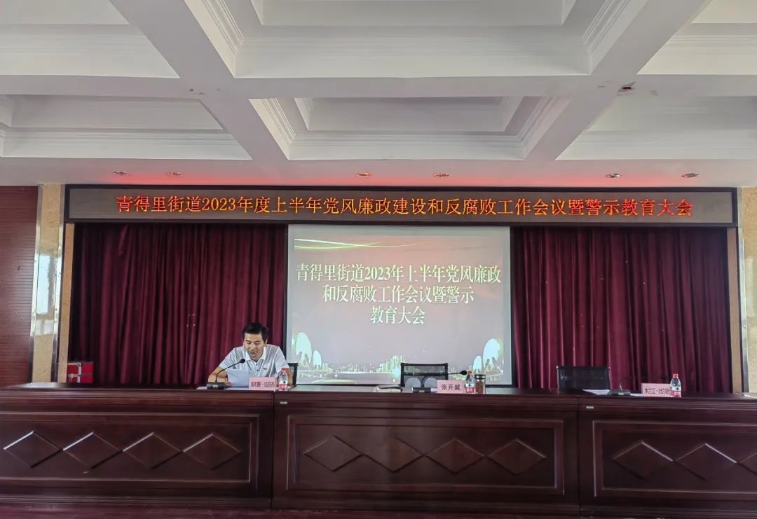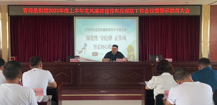 7月27日上午,青得里街道召开2023年上半年党风廉政建设和反腐败工作暨警示教育大会。街道纪工委书记库都斯·库热西主持会议,街道领导班子、各社区书记、第一书记、“访惠聚”工作队队长、各科室负责人共计40人参加会议。