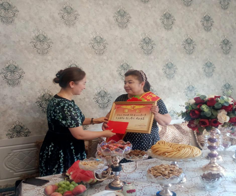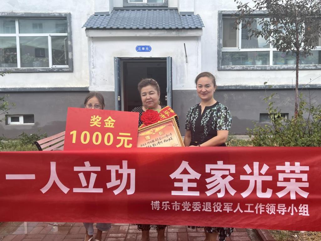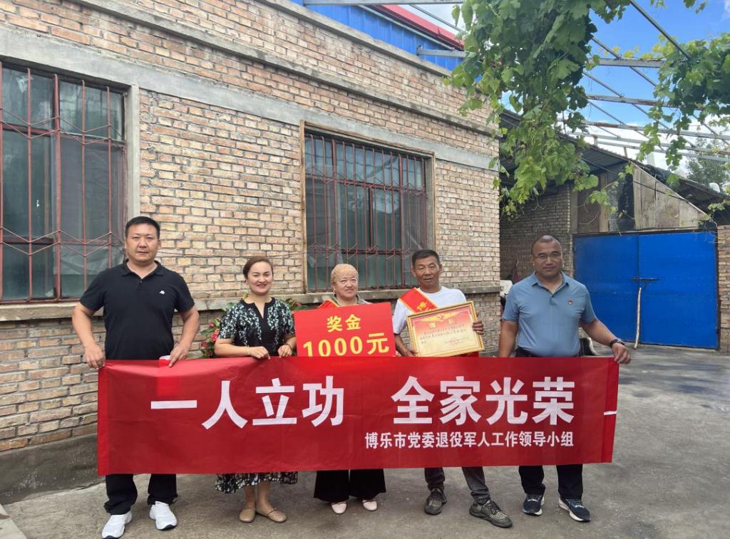 近日,博乐市退役军人事务局党组书记古丽拜克热木、博乐市退役军人事务局工作人员以及小营盘镇退役军人服务站工作人员到荣获“三等功”的2名现役军人家庭送喜报活动。