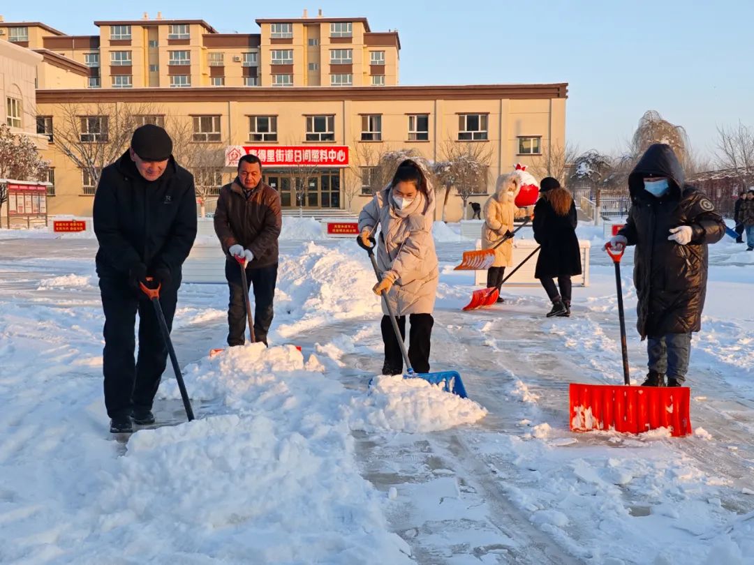 15:30,社区干部们集合,大家扛起事先准备好的推雪板、大扫把,来到小区开展清理积雪。忙碌的身影形成了一道亮丽的风景线。
