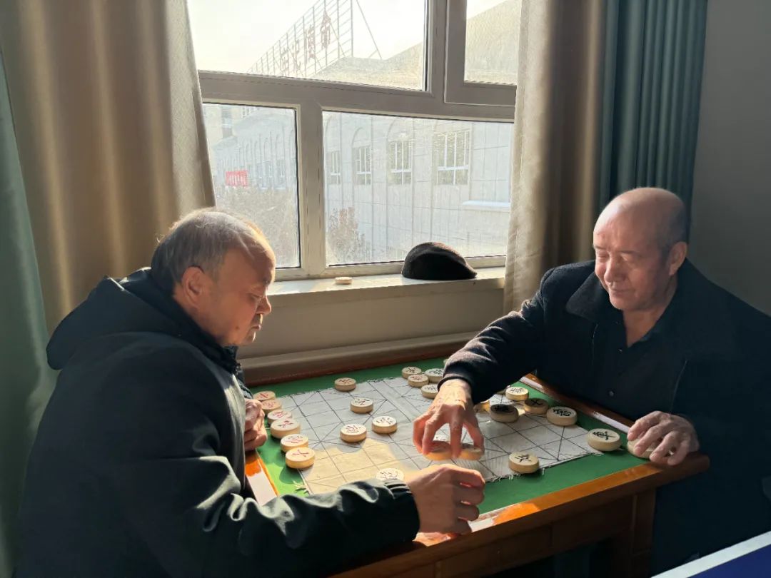 棋牌室的叔叔们两两切磋,认真博弈,全身心投入棋盘中,观棋不语,身旁的伙伴欢喜又焦急,看到自己支持的伙伴占有优势自然欢喜,眼看自己支持的伙伴处于下风心里非常着急而又不能从旁指导,体现出双方对局的魅力。