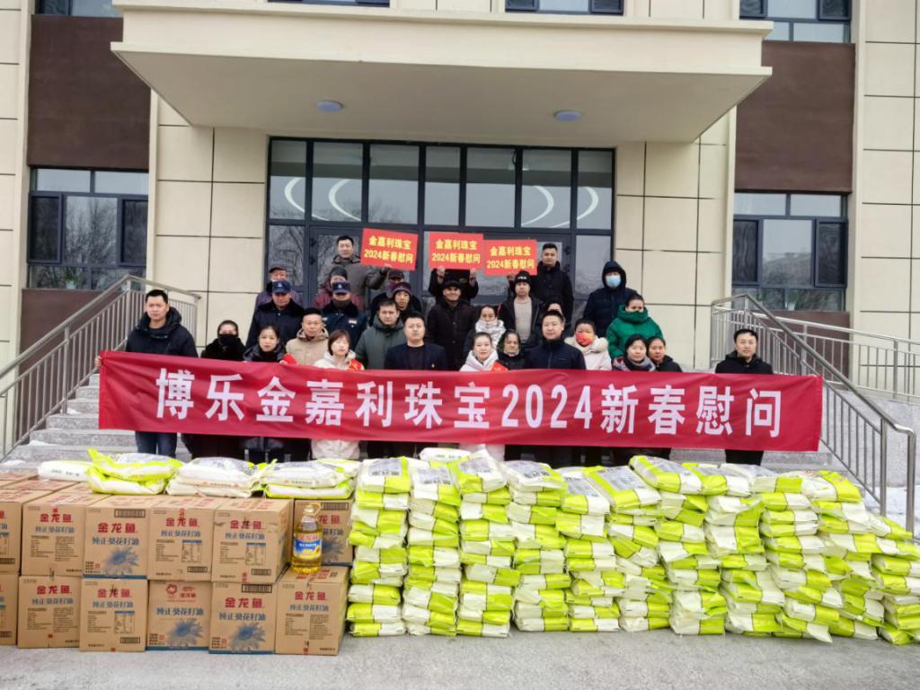 活动首先由街道领导介绍博乐市金嘉利珠宝有限公司的基本情况,随后由博乐市金嘉利珠宝红旗饭店、友好店两位经理讲话并送上新春贺词,金嘉丽珠宝品牌经理为此次捐赠仪式授牌。其次由街道党工委主要领导对博乐市金嘉利珠宝有限公司的125份爱心捐赠表示诚挚的感谢,并祝愿博乐市金嘉利珠宝有限公司在新的一年里生意红火、财源广进。最后街道领导、爱心企业共同向20名困难群众代表发放了捐赠慰问物资,并合影留念。