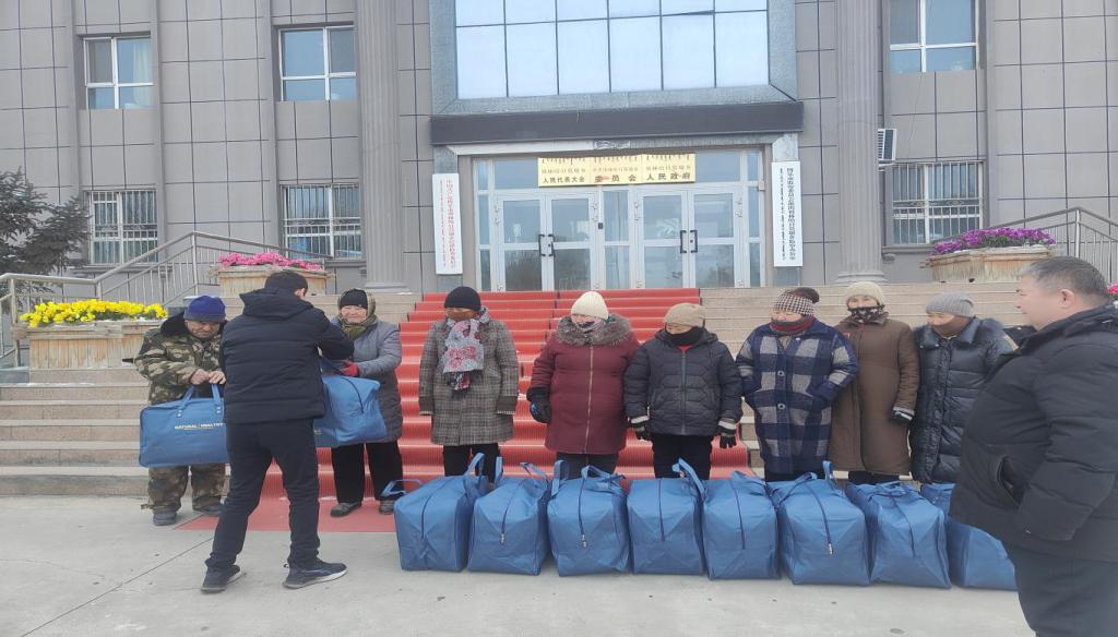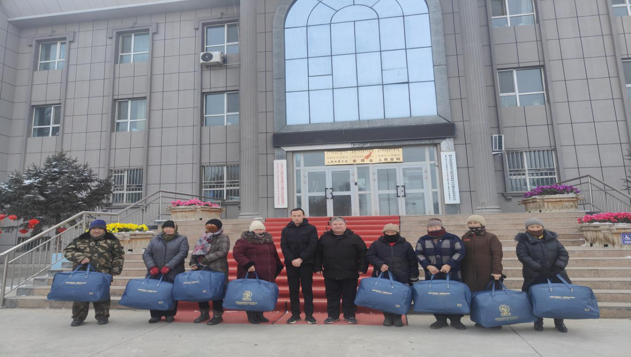 2024年2月1日,辛苦劳作的环卫工人们齐聚在贝林哈日莫墩乡人民政府,博乐市聚鑫家美纺织品有限责任公司负责人为他们分发棉被,并于他们开展深入交流,了解他们心声,同时向他们表达了亲切的问候。