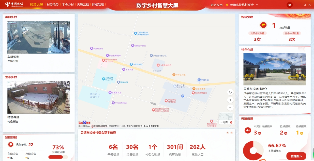 强化数字乡村新基建。构建数字乡村治理共同体是实现乡村振兴的关键路径,同时也是推动乡村治理现代化转型的应有之义。小营盘镇贝德布拉格村通过建设基层数字乡村治理服务一体化平台,整合村内人、地、房、物、事、情等信息,统筹乡村治理、乡村服务等资源,以GIS(地理信息系统)可视化地图的形式将网格信息、事件等作为统一的可视化呈现,打造新型、智慧的基层乡村治理和乡村服务模式,打通数字乡村服务村民的“最后一米”。