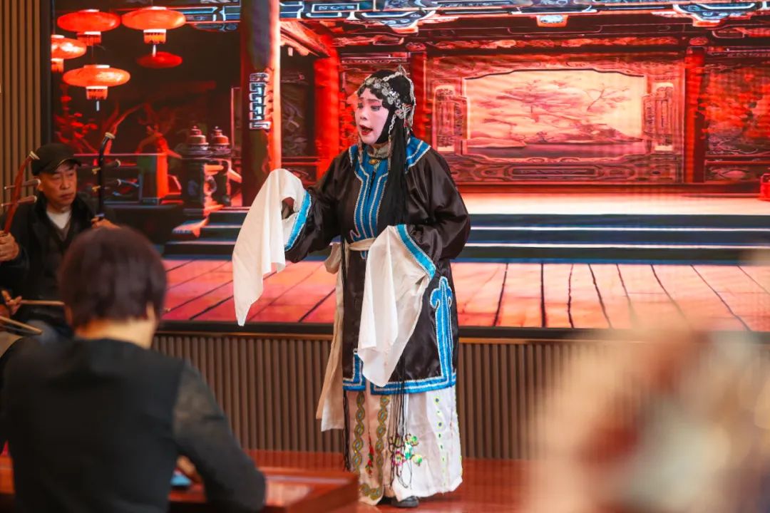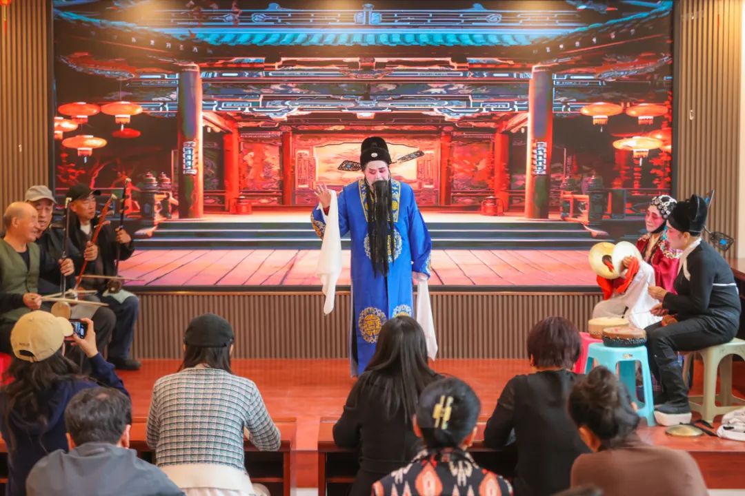 台上,身着传统戏服,脸上涂着浓淡相宜妆容的秦腔爱好者们,一板一眼地表演着秦腔的唱腔和身段,为社区带来了别样的文化氛围。