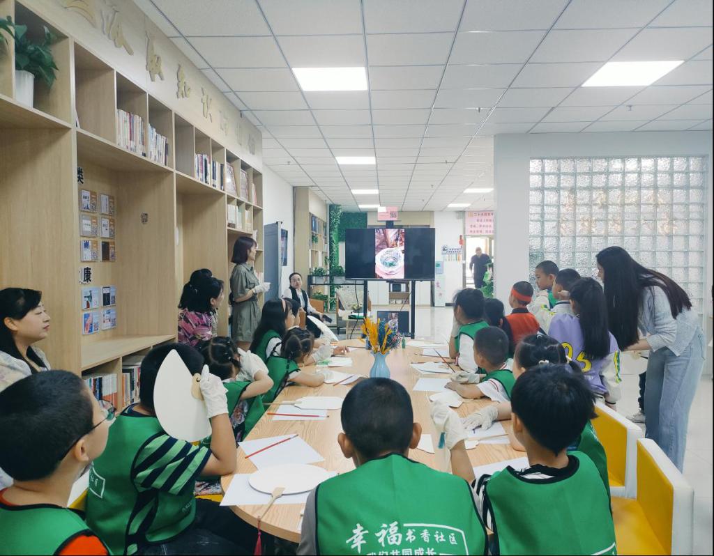 活动伊始,书香社区党总支书记范恒琴首先向大家介绍了漆扇的历史渊源、文化内涵及制作工艺,并播放了如何制作漆扇的视频、示范了制作漆扇的过程。示范结束后,大家跃跃欲试,纷纷开始挑选自己喜欢的颜色进行点漆,彩漆漂浮在水面上,只需将团扇缓慢放入水中,大漆就会随着水流附着在团扇上,水因势而走的痕迹保留了下来,色彩穿插、交错随机而成,流云变幻。妈妈也带着孩子们运用不同的手法浸入扇子,色漆便在扇面上优雅地舞动,最后一把把灵动且多彩的漆扇便跃然眼前,美感自然而生,妙趣天成,精致演绎了中国传统美学。