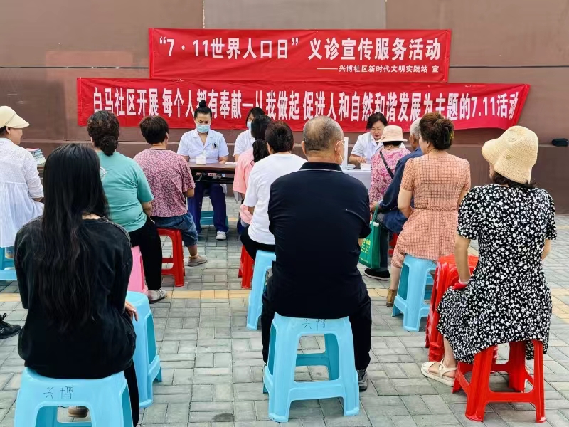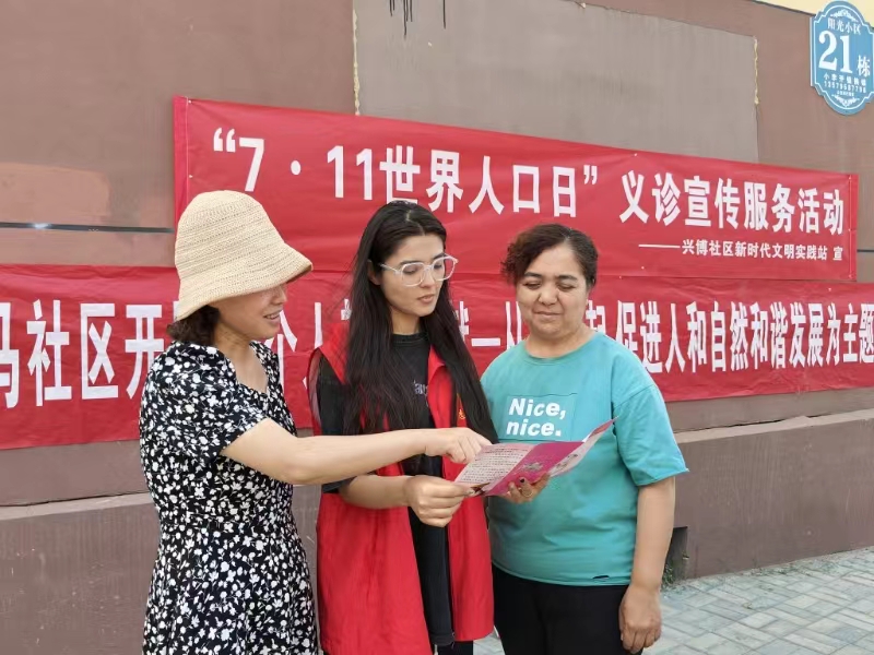 7月10日,兴博社区、白马社区联合博州药材公司、顾里木图街道社区卫生服务中心在阳光小区共同开展了“7·11世界人口日”宣传暨义诊服务活动,引导居民树立正确的婚育观念。此次活动共发放宣传资料70余份,现场咨询50余人,受到群众广泛好评。