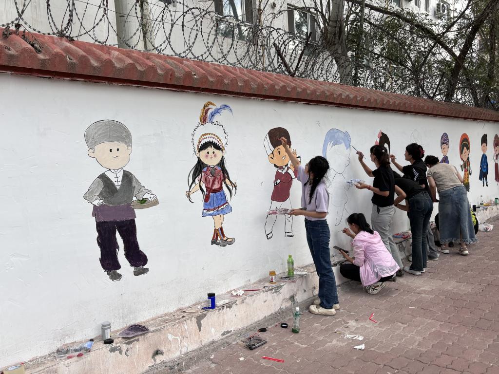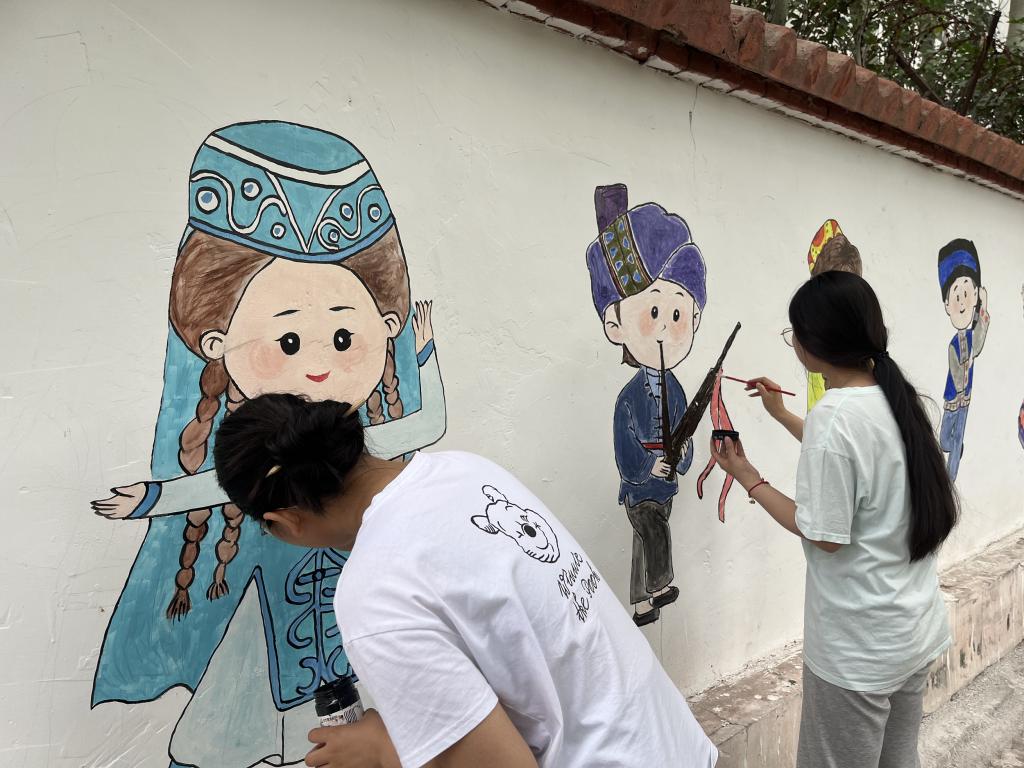 抵达现场后,大家手持画笔,以墙壁为纸,以热情为墨,笔触所及,妙趣横生,为原本单调的墙面注入了新活力。在绘制过程中,他们以最真挚和纯净的情感,精心描绘着每一笔。在大家的共同努力下,身着汉族、蒙古族、维吾尔族等民族服饰的56个“姑娘、小伙儿”逐渐显现出了“真容”,一幅幅彰显浓郁民族风情、民族团结主题的墙绘栩栩如生,十分吸睛。
