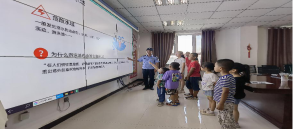 同时村委会也特别邀请了辖区民警,为孩子们上了一堂生动的暑期安全教育课,针对暑期常见的安全问题,通过一个个生动真实的案例向孩子们讲解防溺水、防电信诈骗,防中暑、安全出行等生活应急救援知识,增强少年儿童的自我防范意识。