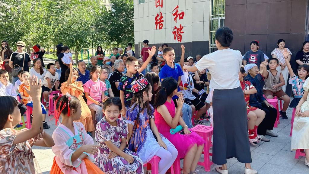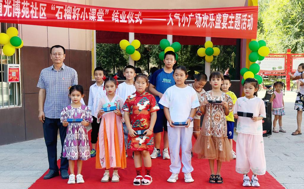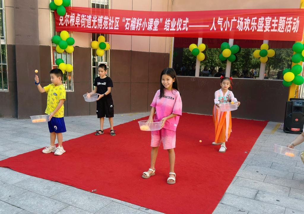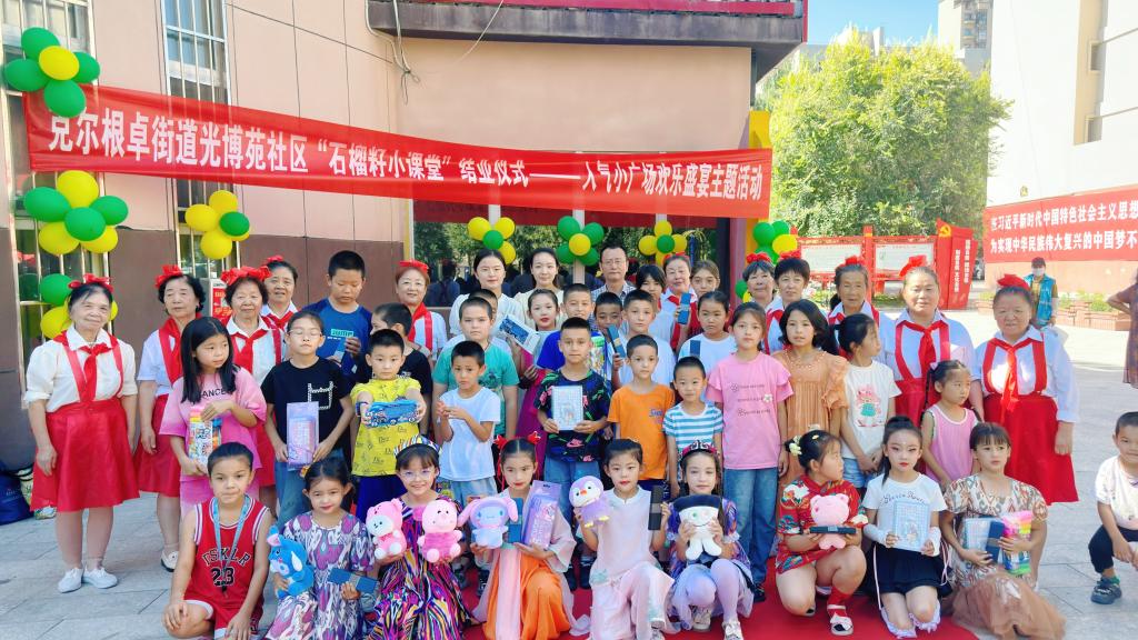 为了庆祝暑期“石榴籽小课堂”圆满结束,更深刻弘扬民族团结精神,促进社区各民族儿童之间的交流与融合,共同为孩子们绘制一幅幅丰富多彩的童年画卷,8月13日,克尔根卓街道光博苑社区组织辖区各族儿童开展了“石榴籽小课堂”结业仪式──人气小广场欢乐盛宴主题活动。