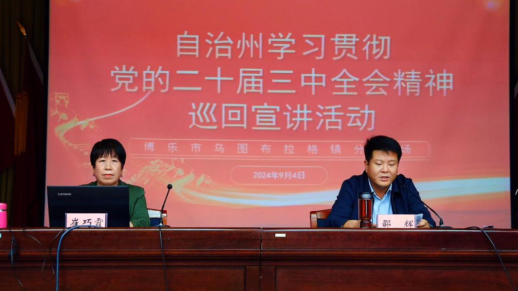 为全面深入学习领会党的二十届三中全会精神,引导广大党员干部群众把思想和行动统一到全会精神上来,自觉把改革摆在更加突出位置,紧紧围绕推进中国式现代化,解放思想、求真务实、真抓实干、奋力开创进一步全面深化改革新局面,根据自治州党委宣传部的统一安排,9月4日,自治州学习贯彻党的二十届三中全会精神巡回宣讲活动走进乌图布拉格镇。活动由乌图布拉格镇党委书记邵辉同志主持,在家班子成员、各村(社区)第一书记、党支部书记、草根宣讲员等66人参加活动。